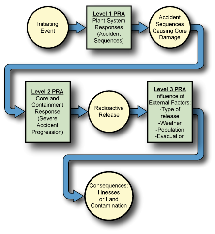 • A Level 3 PRA, which starts with the Level 2 radioactivity release accidents, estimates the consequences in terms of injury to the public and damage to the environment.